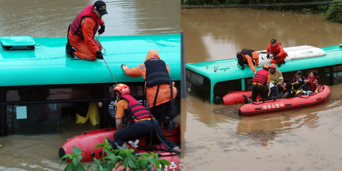 장맛비로 인해 파주 임진강변에 물이 가득 찬 가운데 달리던 버스가 침수하는 사태가 발생했다.