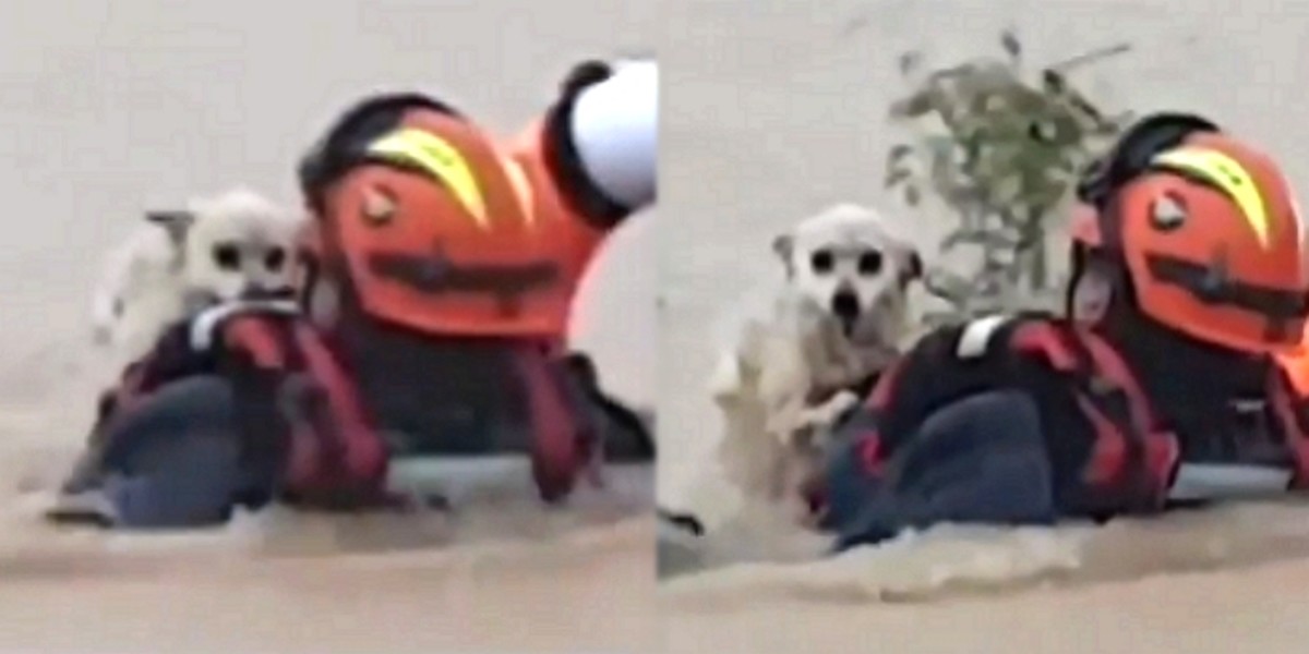 물살을 가르며 안전한 곳으로 이동 중인 구조대원의 품에 안긴 하얀 강아지는 잔뜩 겁먹은 것처럼 보였다.
