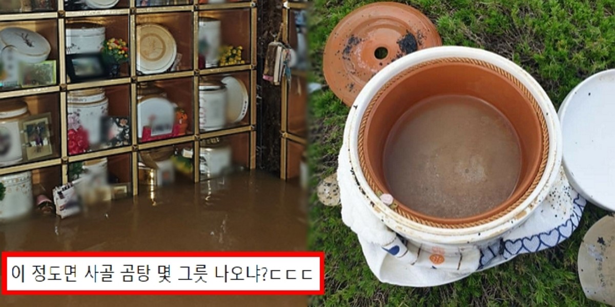 납골당이 물에 잠긴 사진을 공유하고는 "이 정도면 사골곰탕은 몇 그릇이나 나오냐", "여름이라고 조상님들을 워터파크까지 보내줬다" 등 조롱을 했다.