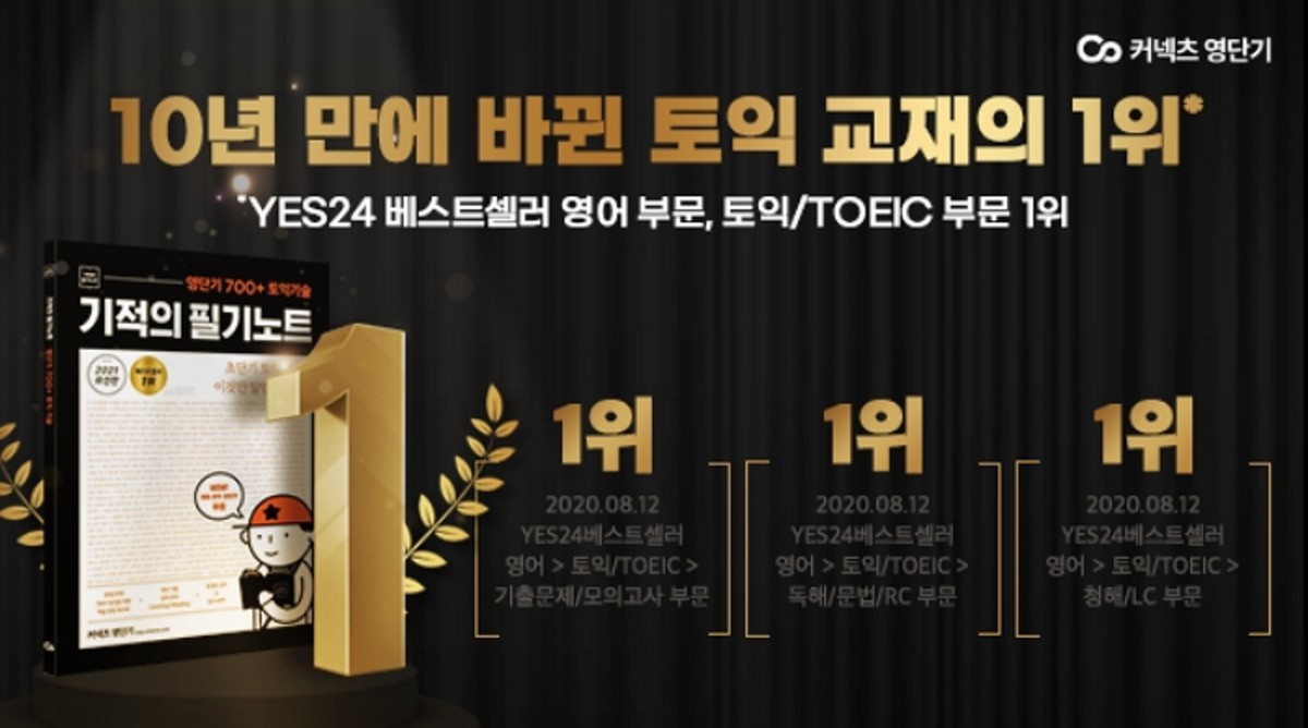 12일 인터넷서점 예스24에서 집계된 베스트셀러 순위(8월 12일 기준, 최근 7일간 판매량 및 주문수 기준)에 따르면, 지난 7월 25일 출간된 '영단기 기적의 필기노트'는 기존 토익 수험서들을 제치고 1위에 등극했다.