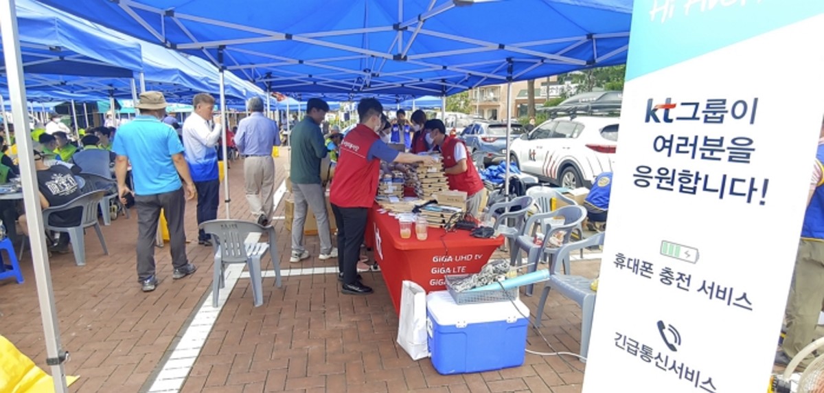 KT 임직원들도 수해 복구에 힘을 보태고 있다. 임직원들로 구성된 '사랑의 봉사단'은 홍수 피해가 심한 지역을 돕기 위해 지난 7일부터 강원도 철원군 김화읍 생창리 마을회관에서 이재민과 재해복구에 나선 자원봉사자를 대상으로 하루 130인분 식사를 배식하는 '사랑의 밥차' 활동을 진행했다.