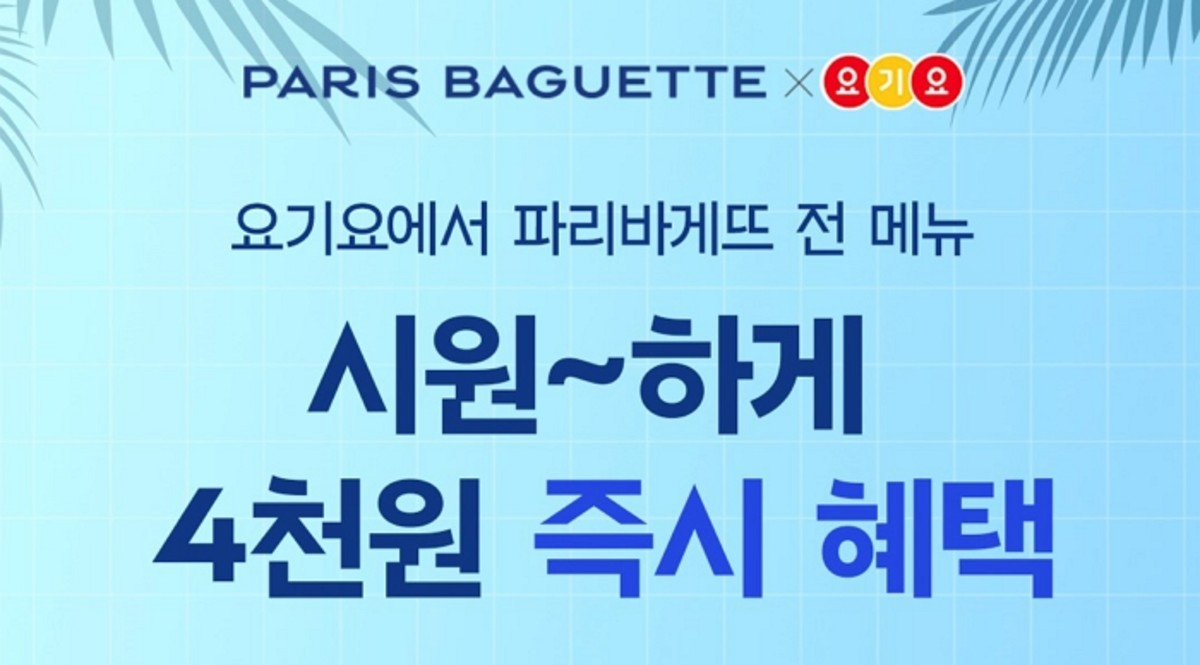 파리바게뜨는 오는 30일까지 소비자가 요기요 어플리케이션을 통해 파리바게뜨 제품을 1만 2천원 이상 주문하면 전메뉴 4천원 혜택을 제공하는 이벤트를 진행한다. 단, 현장 결제 시에는 할인이 불가하다.