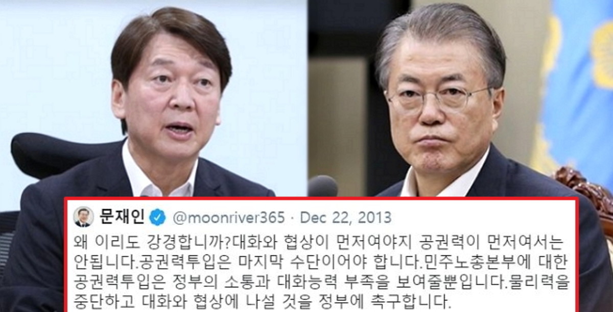 문재인 대통령이 작성한 글에는 지난 2013년 12월 박근혜 정부가 전국철도노동조합 파업에 강경 대응한 것을 가리켜 트위터에 "왜 이리도 강경합니까? 대화와 협상이 먼저여야지 공권력이 먼저여서는 안됩니다"라는 내용의 글이 담겼다.