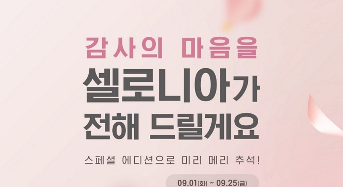 한편, 셀로니아의 추석 언택트 스페셜 기획전은 오는 25일까지 셀로니아 온라인 공식몰에서 진행될 예정이다.
