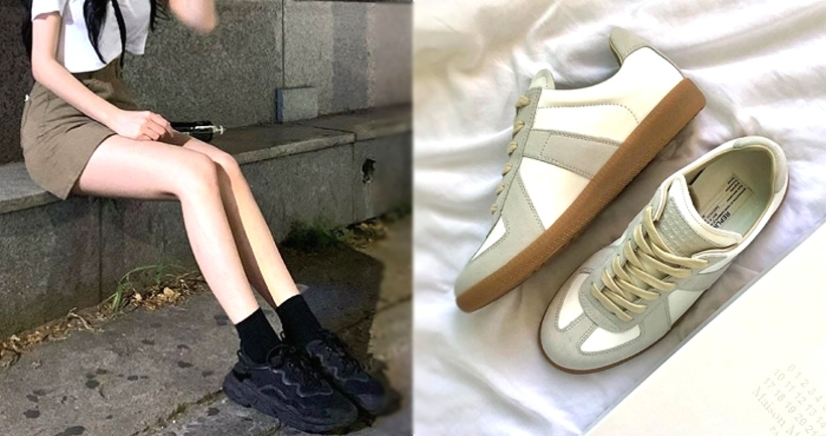 메종 마르지엘라의 베이지 톤 독일군 스니커즈는 심플한 디자인으로 인기를 끌고 있다.