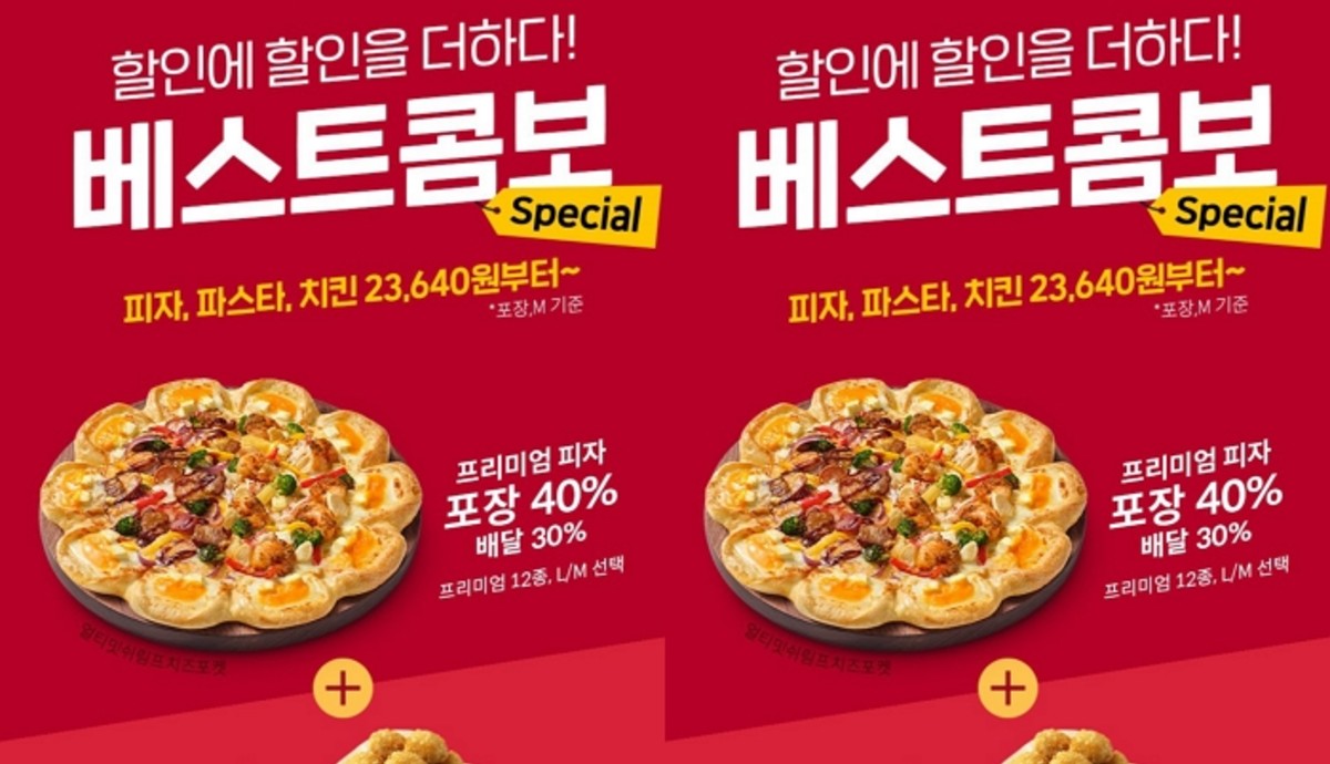 이번 프로모션은 프리미엄 피자를 최대 40% 할인 받으면서(방문포장 40%, 배달 30%) 동시에 리치치즈파스타와 팝콘치킨을 50% 할인된 가격으로 즐길 수 있는 이벤트다.