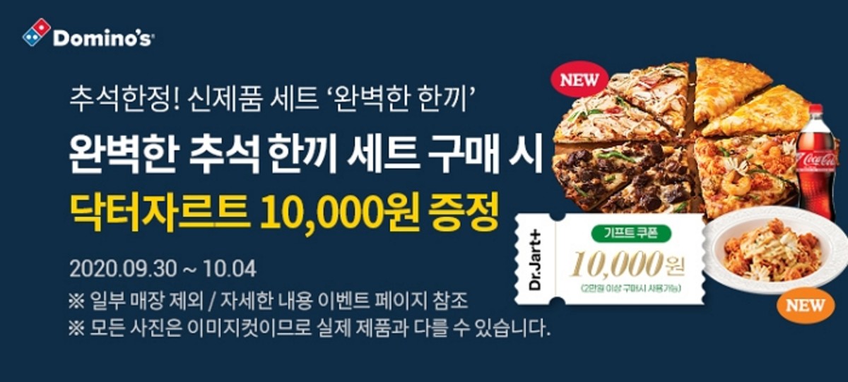 도미노피자 관계자는 "이번 추석 연휴 기간 가족들과 함께 풍성한 한가위 보낼 수 있도록 다양한 프로모션을 진행한다"며 "특히 닥터자르트 기프트 쿠폰 증정은 온라인 주문 시 제공하는 선착순 이벤트인 만큼 이번 기회 놓치지 마시길 바란다"고 전했다.