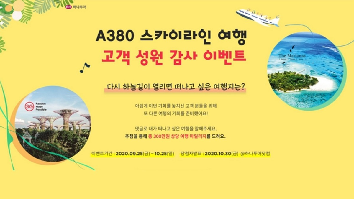 다음달 25일까지 'A380 스카이라인 여행' 이벤트 페이지에서 '다시 하늘길이 열리면 떠나고 싶은 여행지'를 댓글로 작성하면 추첨을 통해 총 300만원 상당의 하나투어 마일리지를 제공한다.