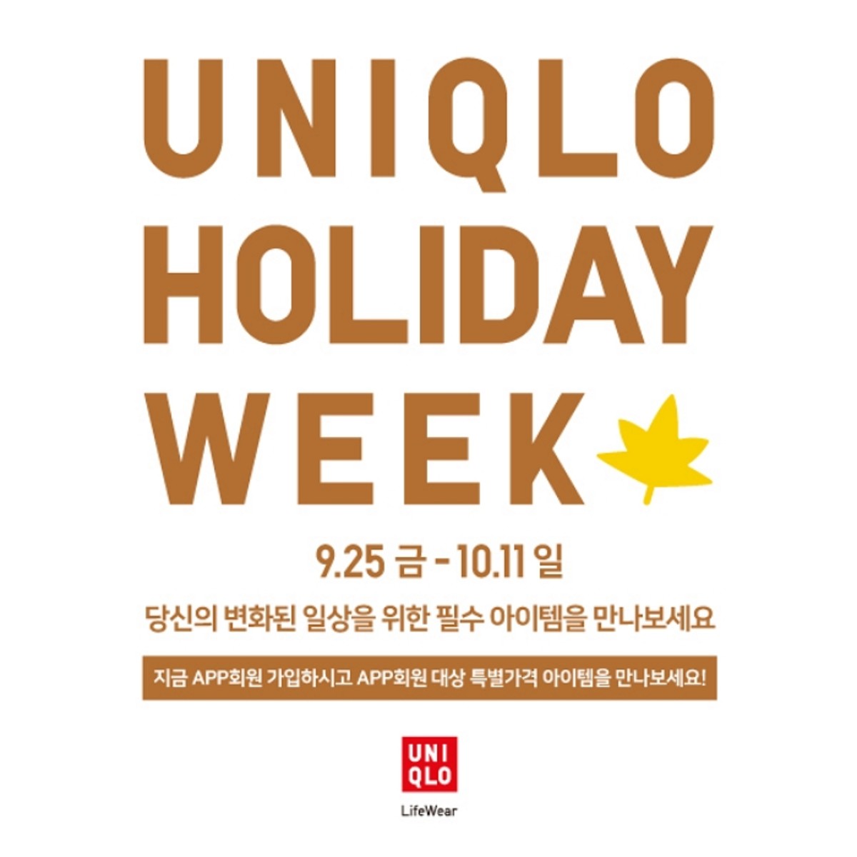 이번 홀리데이 위크는 전국 유니클로 매장과 온라인 스토어에서 진행하며, 할인 품목에 대한 자세한 정보는 유니클로 온라인 스토어와 카카오톡 플러스친구, 모바일 애플리케이션 등에서 확인할 수 있다.