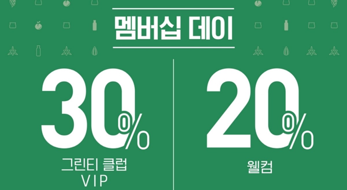 멤버십데이는 이니스프리 회원이라면 누구나 할인 혜택을 받을 수 있는 멤버십 세일로 제품 구매 시 그린티클럽·VIP 등급은 30%, 웰컴 등급은 20%로 등급별 할인이 적용된다.