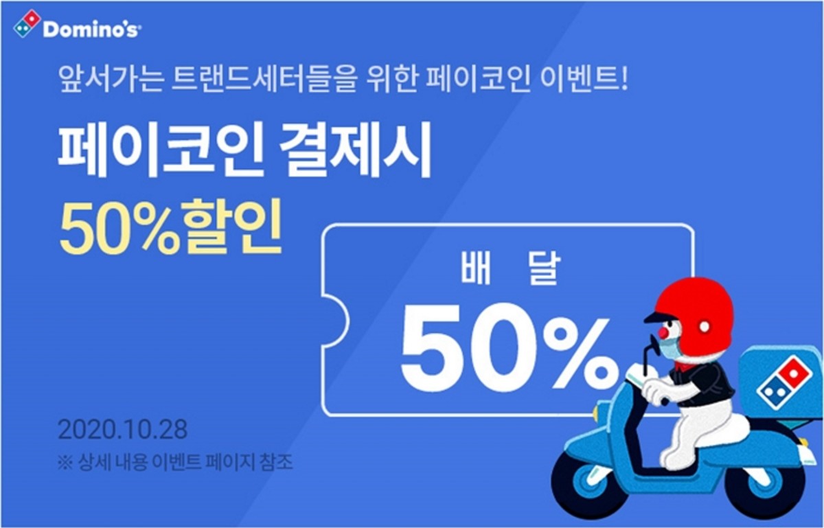 도미노피자는 내일(28일) 하루 동안 페이코인으로 피자 배달 주문 결제 시 반값 할인한다. (자세한 사항은 도미노피자 홈페이지 참조)