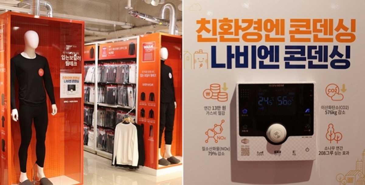 매장 곳곳에 비치되어 있는 리플릿을 살펴보니 이번 시즌 웜테크의 콘셉트는 '친환경 입는 보일러'였다. 편안하고 따뜻한 옷차림을 통해 실내 난방온도를 낮춰 에너지를 절약하는 스파오 발열내의, 그리고 보일러를 작동할 때 발생하는 배기가스의 숨어있는 열을 재활용해 에너지 사용을 줄이는 나비엔 콘덴싱보일러가 '친환경' 테마를 접점으로 뭉친 것이다.