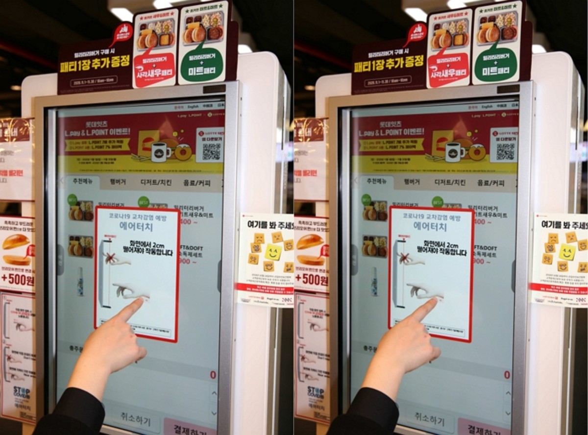 이번 비접촉시 터치 스크린 '에어택트 스크린'은 롯데리아 강남우성사거리점, 노량진점과 엔제리너스 수유역점, 건대역점 등 총 4곳에서 약 4주간 시범 운영할 계획이다.