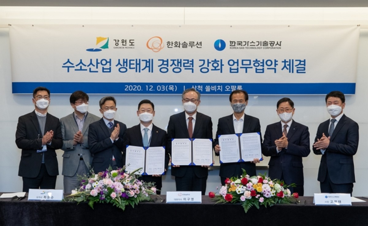 [인사이트] 전준강 기자 = 한화솔루션은 3일 강원도·한국가스기술공사와 '강원도 수소산업 생태계 경쟁력 강화'를 위한 업무협약을 체결했다고 밝혔다.