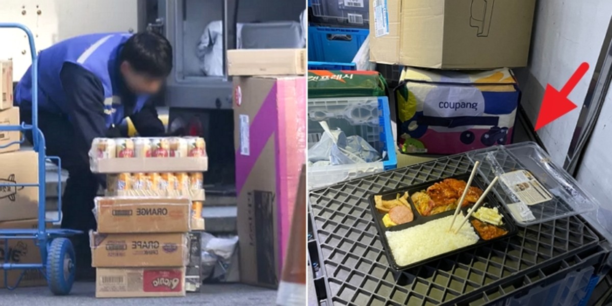 사진 속 쿠팡맨은 택배 물품을 담은 탑차 안에서 도시락을 먹고 있다. 그는 택배로 보낼 물건들이 뒤섞인 차 안에서 박스를 식탁 삼아 식사를 하고 있다.