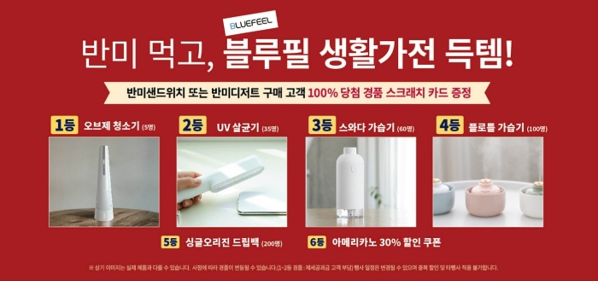 엔제리너스가 운영하는 이번 경품 프로모션은 '블루필'과의 제휴를 통해 엔제리너스 반미 샌드위치 또는 반미 디저트 제품 구매 고객 대상 100% 경품 당첨 스크래치 카드를 증정한다.