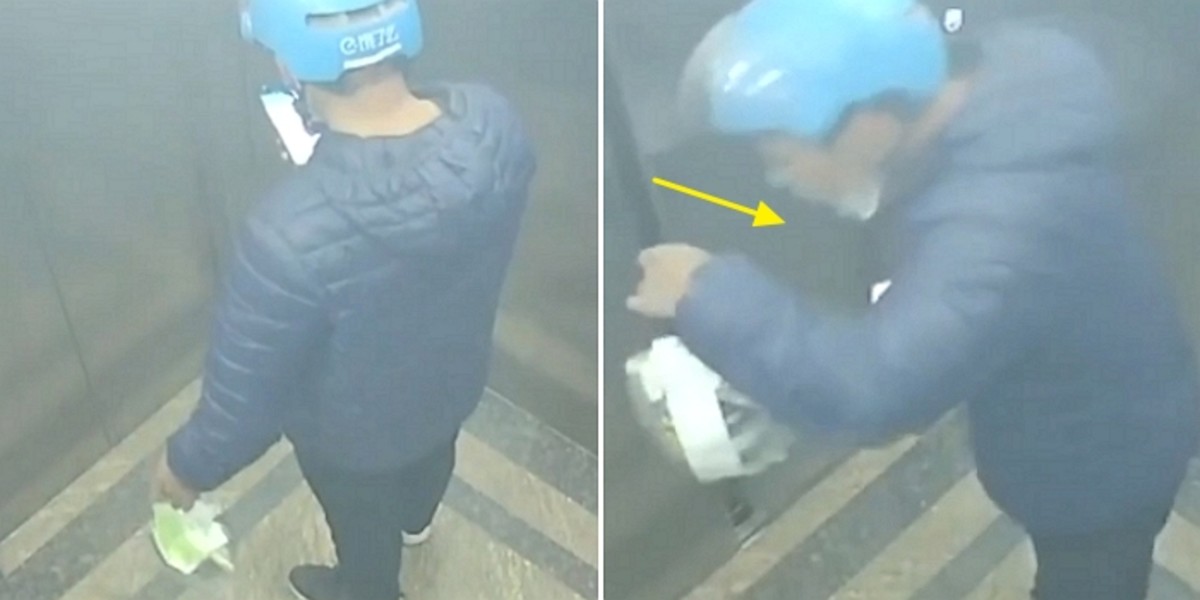 지난 23일(현지 시간) 온라인 미디어 피어비디오는 중국의 한 배달부가 엘리베이터에서 고객의 음식에다 입을 대고 침을 뱉는 CCTV 영상을 공개했다.