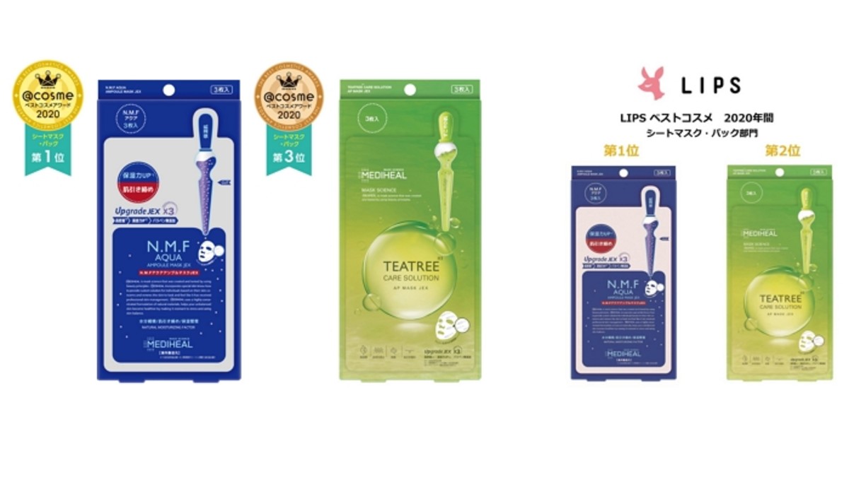 메디힐 'N.M.F 아쿠아링 앰플마스크'와 '티트리 케어 솔루션 에센셜 마스크'가 앳코스메와 립스 2020 베스트 코스메틱 어워드에서 나란히 최상위권에 올랐다.