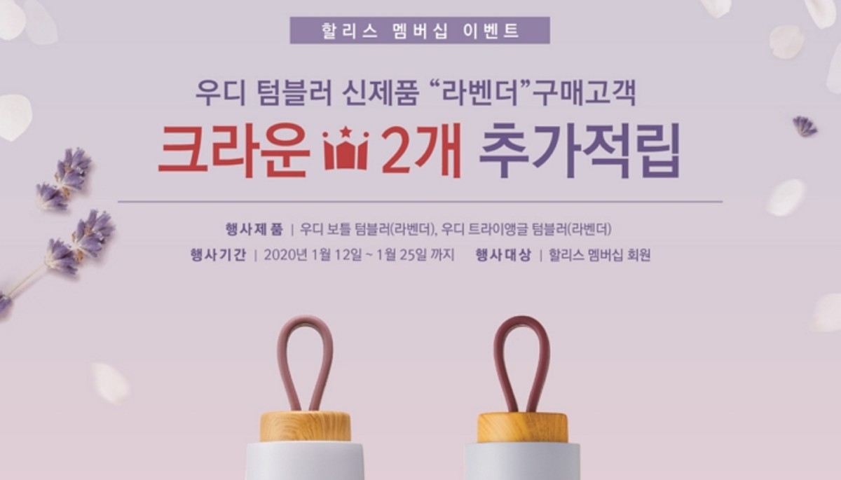 신제품 출시를 기념해 12일부터 25일까지 '우디 텀블러 라벤더' 2종 구매고객을 대상으로 크라운 2개 추가 적립 프로모션을 진행한다.