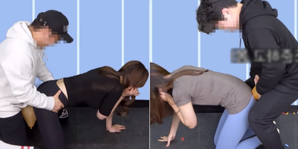 남성은 성관계를 연상하게 하는 자세로 여성의 허리를 잡는다. 이후 하반신으로 풍선에 압박을 가하는 모습이다.