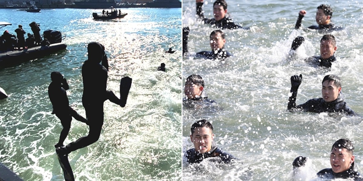 특수 잠수부대원들은 추위에 아랑곳하지 않고 불사의 정신으로 수영 훈련을 이어갔다.