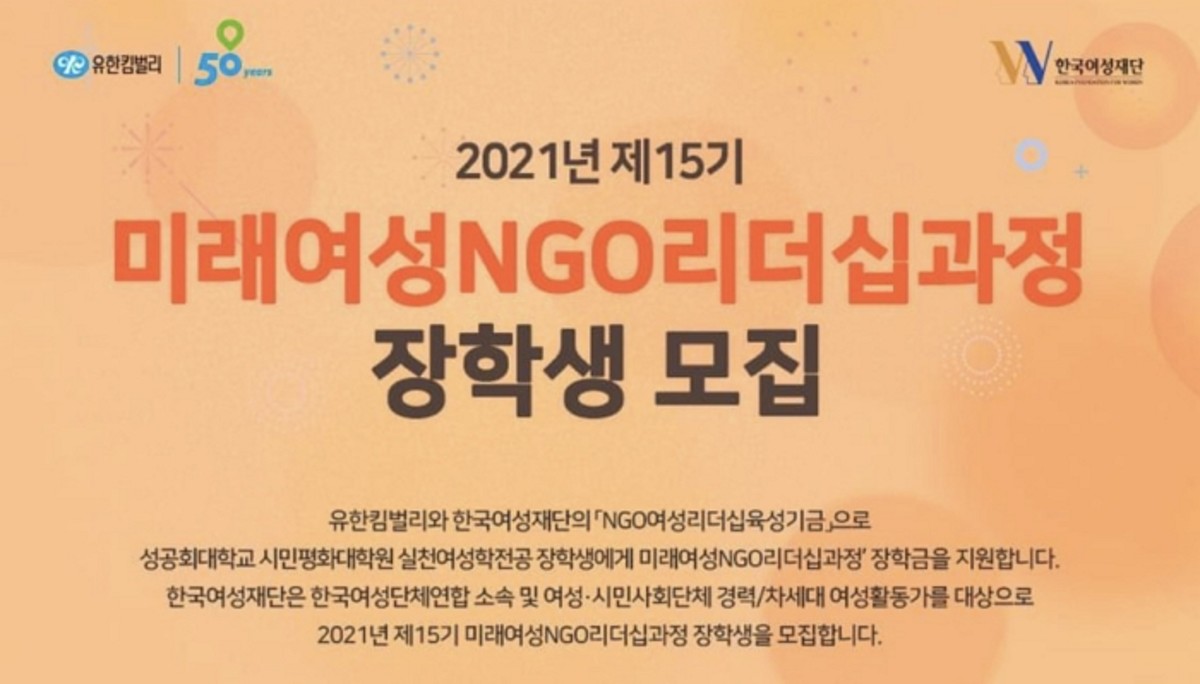 유한킴벌리는 2007년부터 여성재단과 함께 여성활동가를 대상으로 NGO 리더십 육성기금을 운영하고 있다. 여성단체, 대학, 기업이 함께 참여하는 상생모델인 NGO 리더십 장학생 과정은 여성리더를 대상으로 하는 석사과정과 5년차 미만 여성활동가들을 대상으로는 단기 리더십과정이 있다.