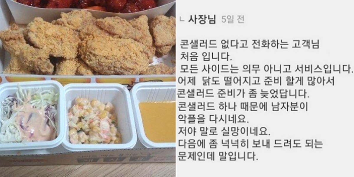 사장은 답글에서 "콘 샐러드 없다고 전화하는 고객님 처음이다. 모든 사이드는 의무 아니고 서비스다"라고 토로했다.