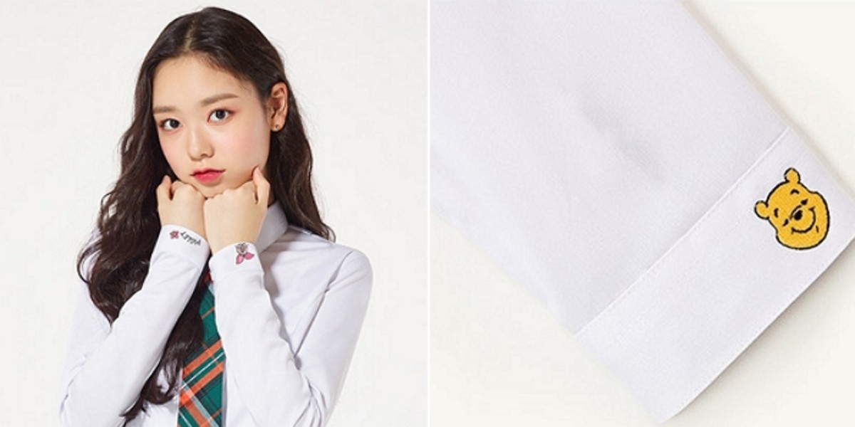 사진에는 디즈니를 대표하는 미키마우스, 곰돌이 푸, 피글렛 그리고 토이 스토리의 포키까지 네 종류 디자인이 교복 소매 끝자락에 작게 자수 처리돼 있다.