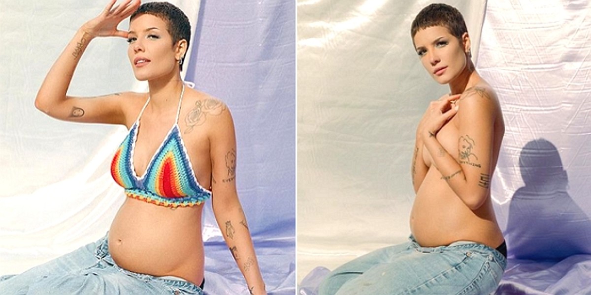 공개된 사진 속에는 할시가 무지개 비키니 톱에 청바지를 입고 임신한 배를 내보이고 있는 모습이 담겼다. 또 다른 사진에는 팔로 상반신을 가린 채 배를 보이고 있어 눈길을 끈다.