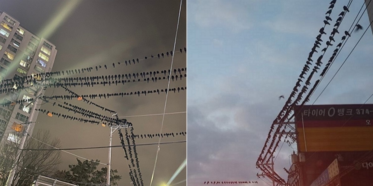 28일 여러 커뮤니티와 SNS에는 까마귀 수백 마리가 아파트 인근 전선과 전봇대를 점령한 사진 한 장이 확산하고 있다.