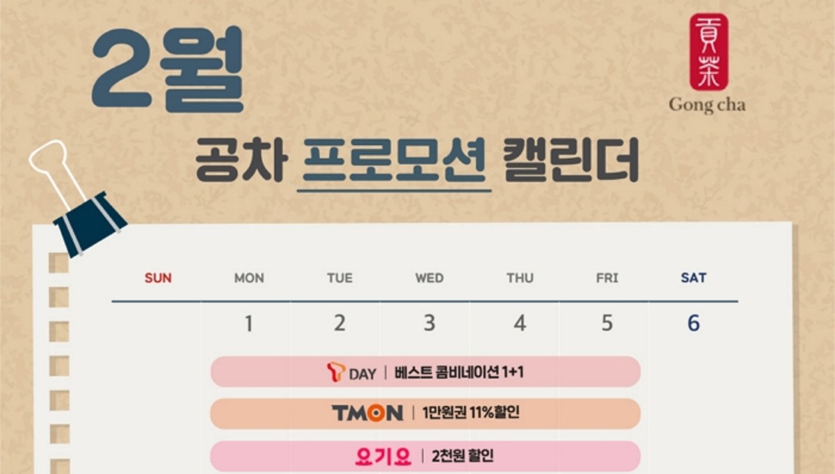[인사이트] 천소진 기자 = 공차코리아가 2월 한 달 내내 꽉 찬 프로모션을 진행하면서 이를 한눈에 볼 수 있는 공차 프로모션 캘린더를 공개했다고 밝혔다.