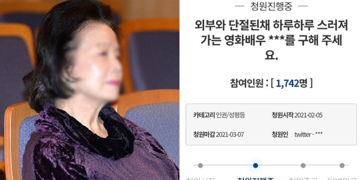 지난 5일 청와대 국민청원 게시판에 '외부와 단절된 채 하루하루 스러져가는 영화배우 윤**를 구해 주세요'라는 글이 올라왔다.