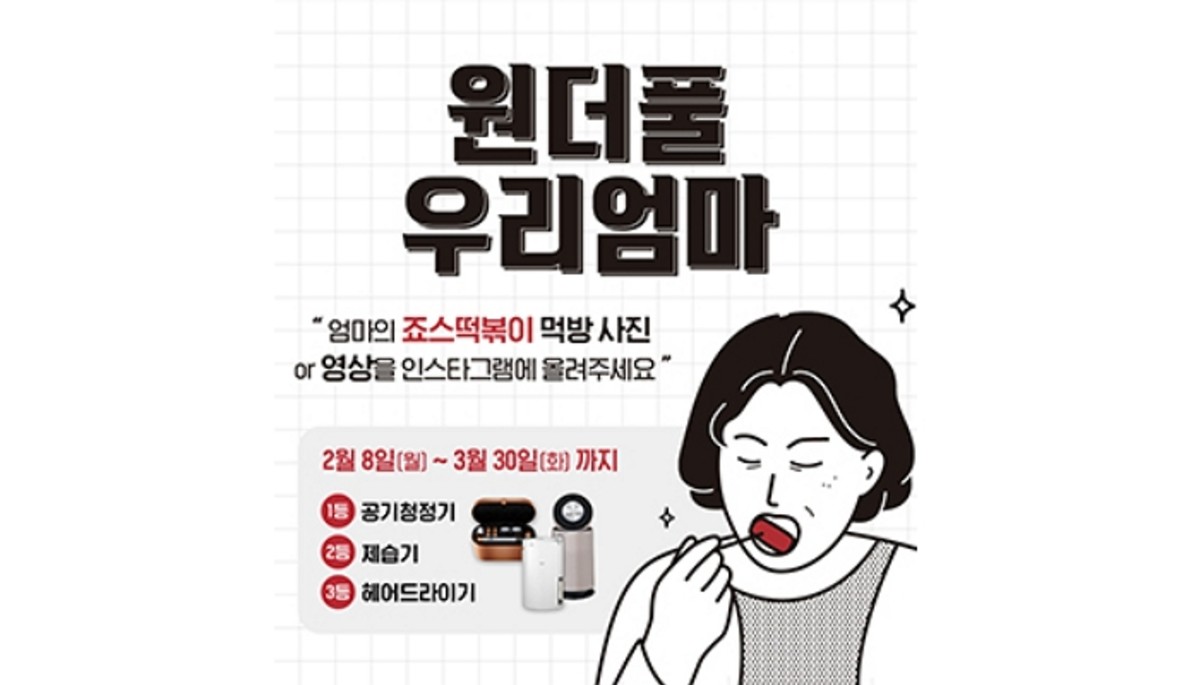 이번 캠페인 참가자에게는 LG 퓨리케어 공기청정기(1명), LG휘센 제습기(1명), 다이슨 헤어드라이기(1명), 마사지건(3명), 죠스떡볶이 1만원 모바일 상품권 등 경품이 증정될 예정이다.