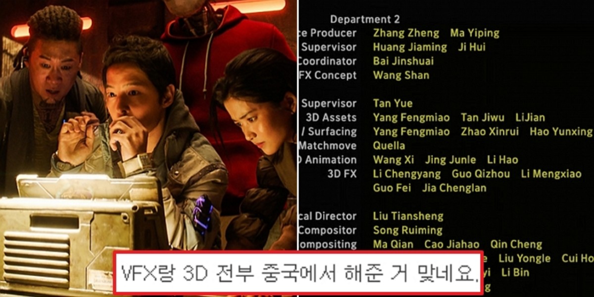 작성자는 승리호의 크레딧 화면 캡처 사진도 함께 첨부했다. 'Department 2, 3' 화면에 나온 VFX(Visual Effect), 3D에는 모두 중국인의 이름이 올라가 있었다.