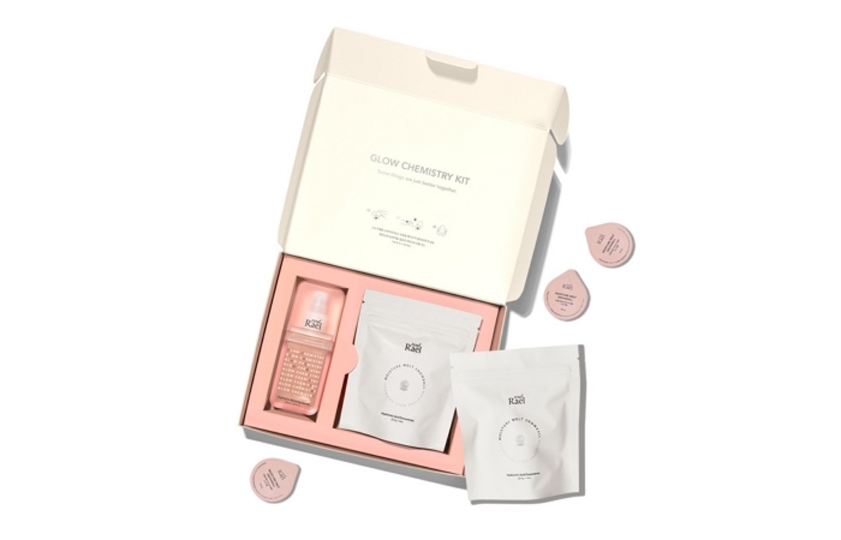 리얼라엘 '글로우 케미스트리 키트'는 강력한 활력 성분이 함유된 부스팅 세럼 '글로우 케미스트리 세럼'과 무방부제 고농축 100%의 3중 히알루론산을 담은 '모이스처 멜트 스노우볼'로 구성되어 있다.