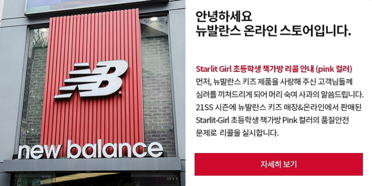 지난 16일 이랜드월드는 뉴발란스 키즈는 최근 국가기술표준원의 안전성 조사에서 프탈레이트계 가소제가 기준치 이상으로 발견된 스탈릿걸(Starlit-Girl) 초등학생 책가방 핑크 컬러 제품의 리콜을 시작했다.
