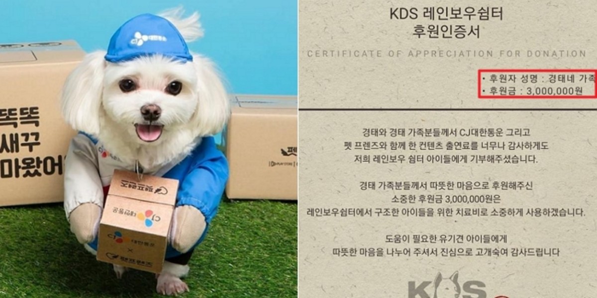 지난 21일 경기도 용인시에 위치한 유기동물보호소 KDS 레인보우쉼터는 인스타그램을 통해 경태와 경태아부지의 기부 소식을 알렸다.