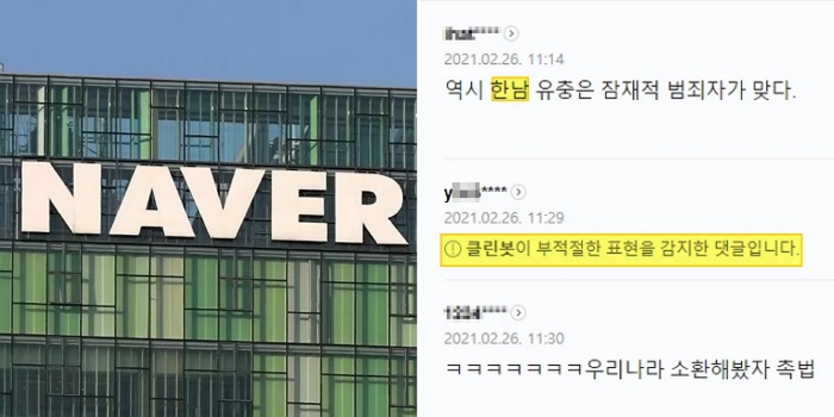 클린봇 작동 중에도 '한남'은 노출 중인 댓글 창 / 네이버