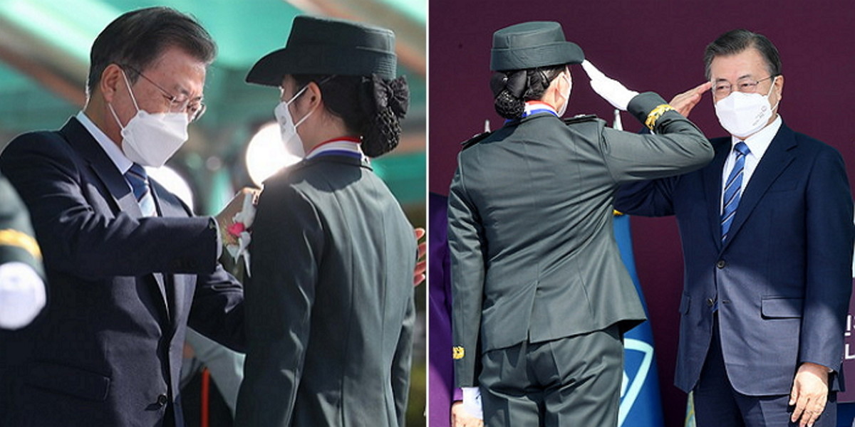 문 대통령은 이날 코로나19 상황으로 인해 졸업 및 임관식에 참석하지 못한 생도들 부모님들을 대신해 임관 장교 전원에게 계급장을 직접 수여하기도 했다.