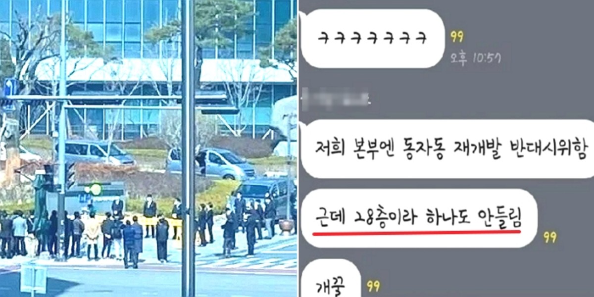 올라온 카카오톡 대화 내용에는 다른 직원이 "저희 본부엔 동자동 재개발 반대시위함. 근데 28층이라 하나도 안 들림"이라고 말한 내용이 담겼다.