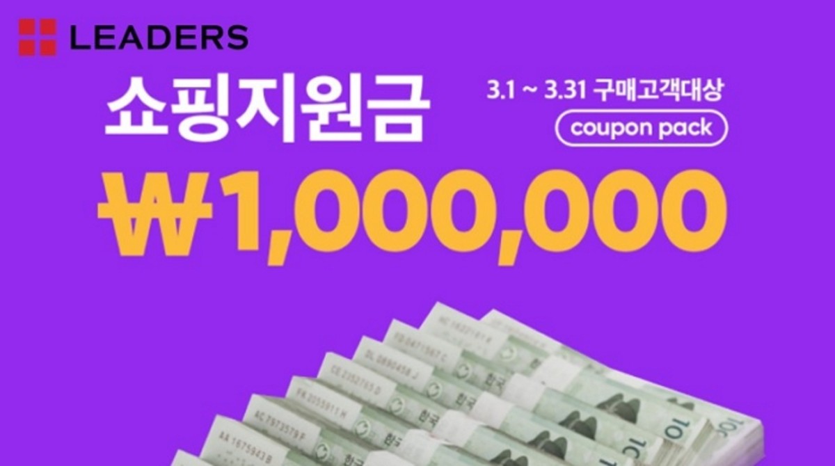 이번 '3월 구매왕에게 100만원 쏩니다' 프로모션은 오는 31일까지 리더스 온라인 공식몰에서 진행되며, 3월 구매왕 5명에게 100만원 상당의 쿠폰팩을 선물한다.