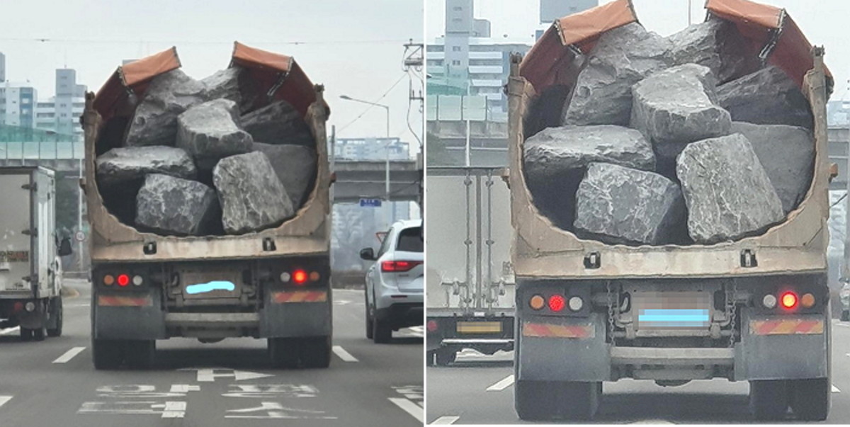[인사이트] 전준강 기자 = 경기도의 한 도로에서 수천kg을 넘는 바위를 가득 싣고 다니는 트럭이 목격됐다.