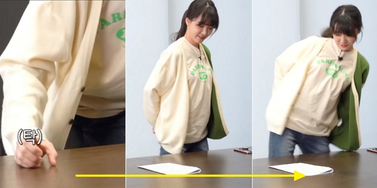 김민아는 테이블 위에 무언가를 내려놓는 시늉을 한 뒤 열중쉬엇자세로 허리를 튕겼다.