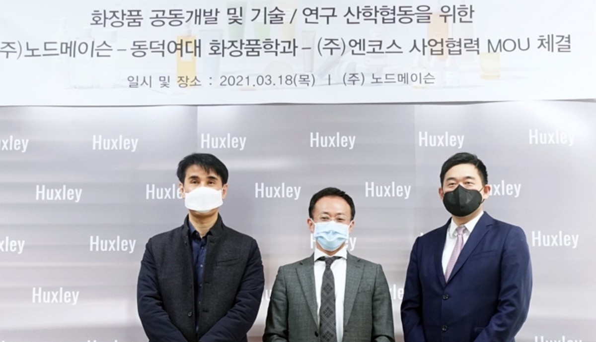 [인사이트] 김한솔 기자 = '헉슬리'를 전개하고 있는 노드메이슨이 제조사 엔코스 및 동덕여대 화장품학과와 중소 K뷰티 산업 발전과 화장품 산학협력을 위한 3자간 업무 협약을 체결했다.