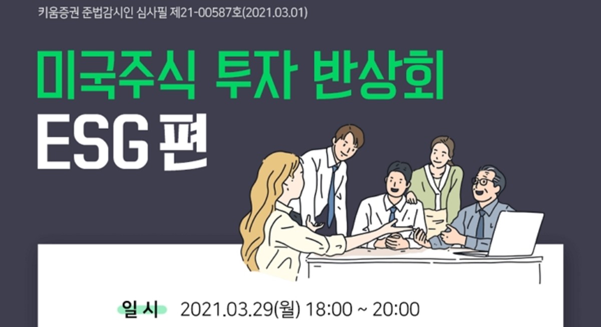 분기마다 진행될 예정인 온라인 미국주식투자 반상회 1기에서는 'ESG 투자'를 주제로 한국 열린사이버대학교의 이항영 교수, US STOCK의 장우석 본부장, 그리고 키움증권 글로벌리서치팀 안석훈 팀장이 진행하며 키움증권 홈페이지(방송·상담·교육), 영웅문S글로벌에서 시청할 수 있다.