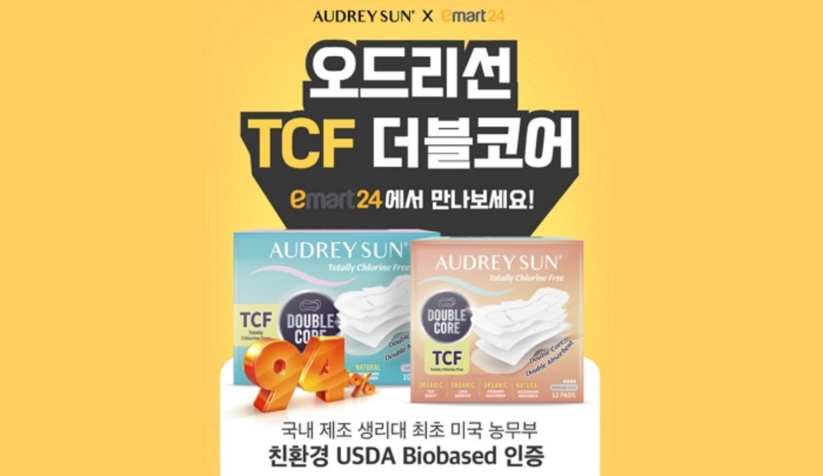 이마트24를 통해 만나볼 수 있게 된 제품은 오드리선의 'TCF 더블코어 생리대'로 국내 제조 생리대로는 처음으로 유기농 순면과 천연압축펄프의 이중흡수체와 완전무염소(TCF) 공정을 적용했다.
