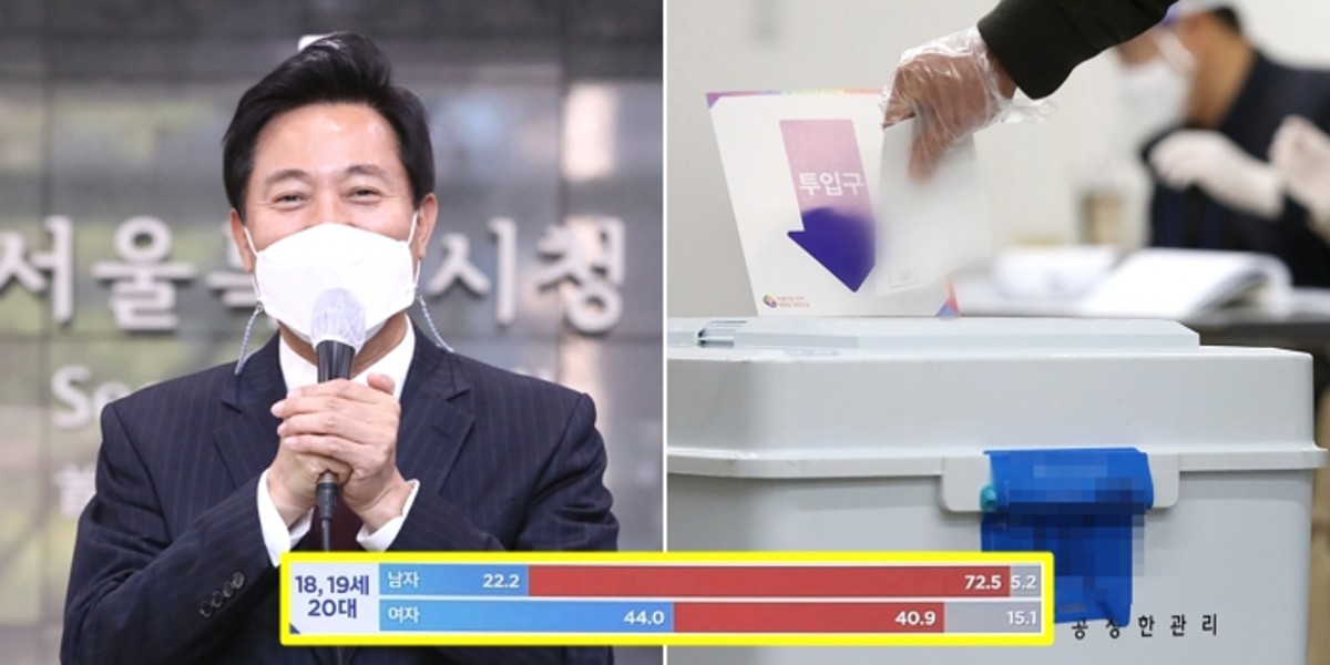 지난 7일 KBS, MBC, SBS 등 지상파 방송 3사가 발표한 공동 예측(출구) 조사에 따르면, 18세와 19세, 20대 이하 남성의 오세훈 후보 지지율은 72.5%에 달했다.