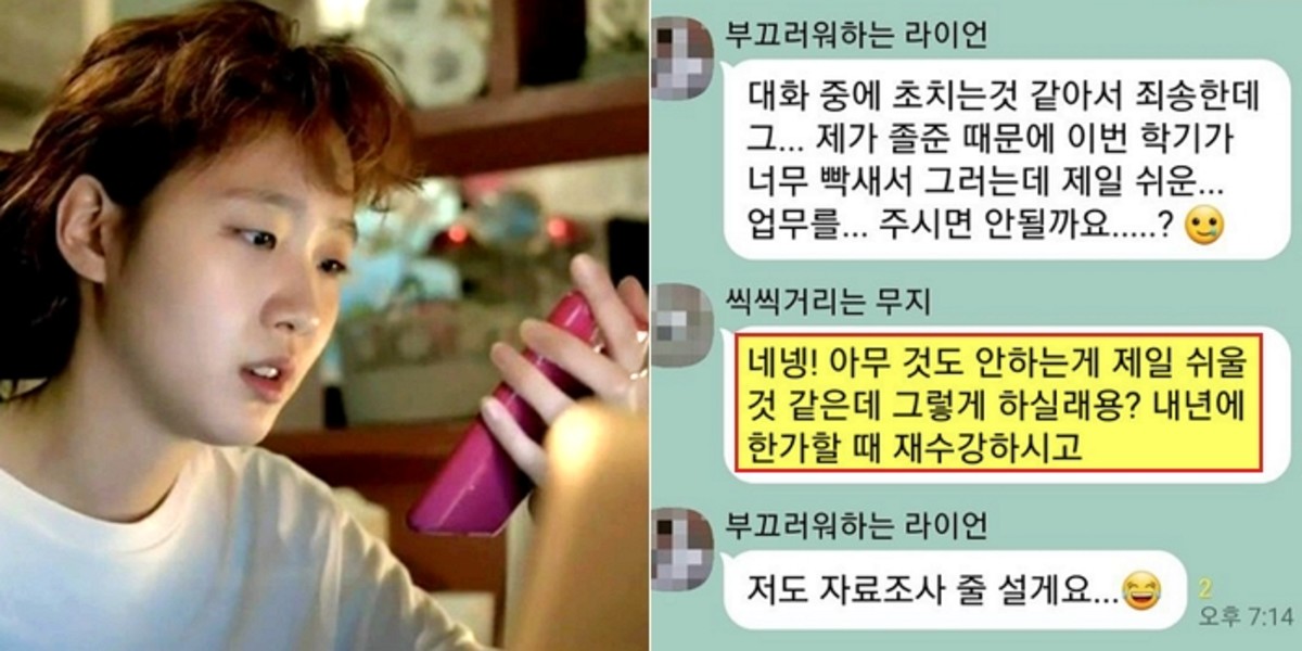 그는 "대화 중에 초 치는 것 같아서 죄송한데 제가 졸준(졸업준비) 때문에 이번 학기가 너무 빡세서 그런데 제일 쉬운 업무를 주시면 안되겠냐"고 물었다.