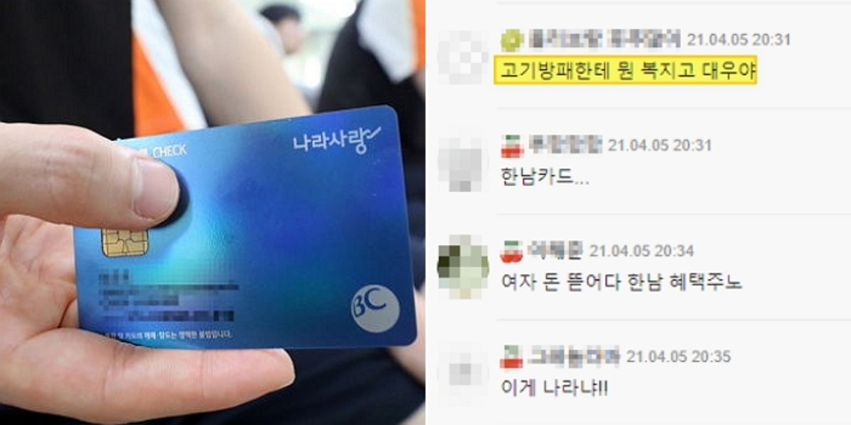 한편 A씨의 주장과 달리 여군의 경우 직업군인(간부)로 나라사랑카드가 아닌 '국방복지카드'를 받게 된다. 해당 카드는 이들이 부러움을 표한 나라사랑카드와 비교해 더 많은 혜택을 제공한다.
