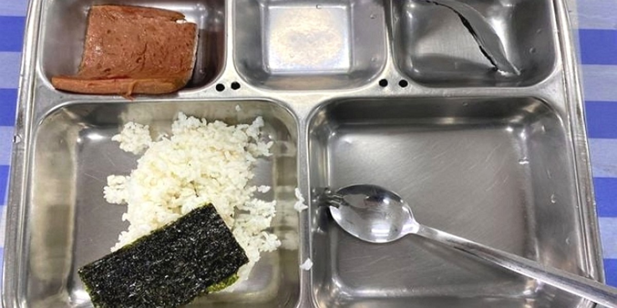 식판에는 밥 조금과 김 두세 장, 런천미트 한 조각이 담겨 있다. 한눈에도 부실하기 짝이 없는 모습이다.
